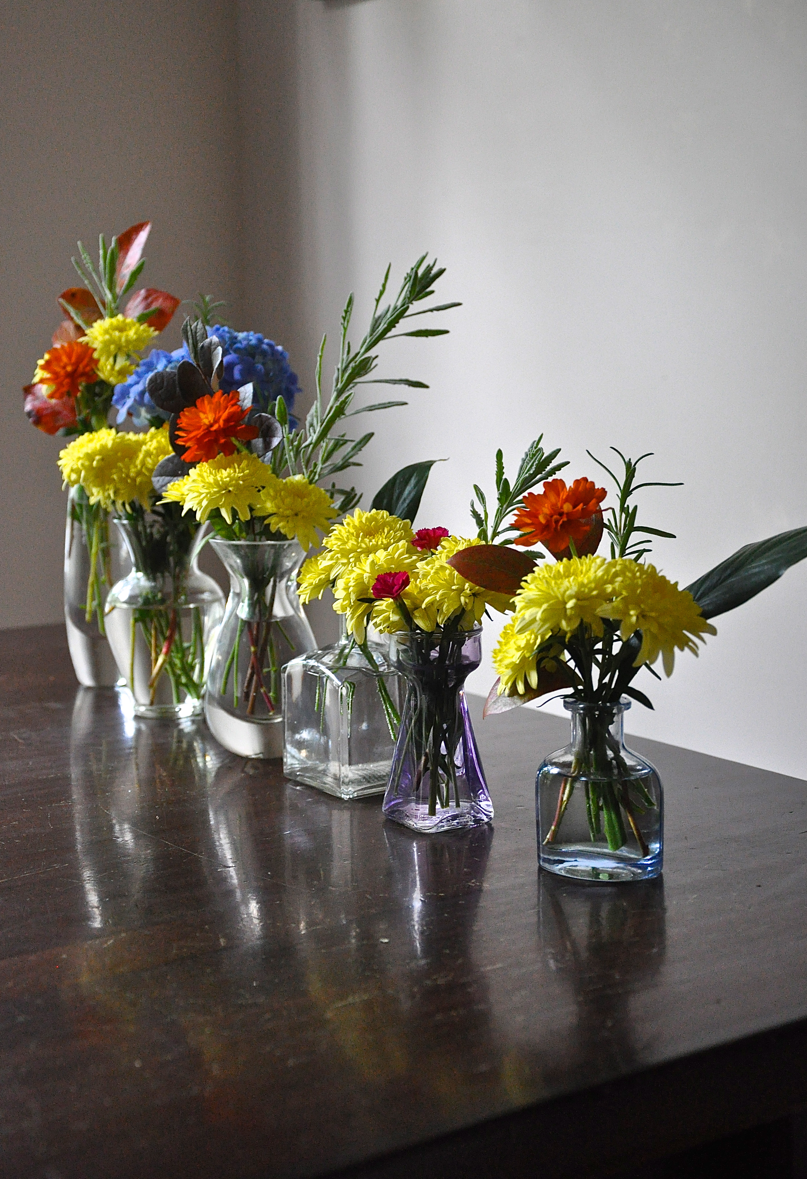 I collect flowers & herbs & leaves from around my house & in my gardens & place these vases all over the house. Hannah had seen them sitting on the table & said nothing because it is such a common sight. When she got home & they were all in her room, she was so touched & happy.