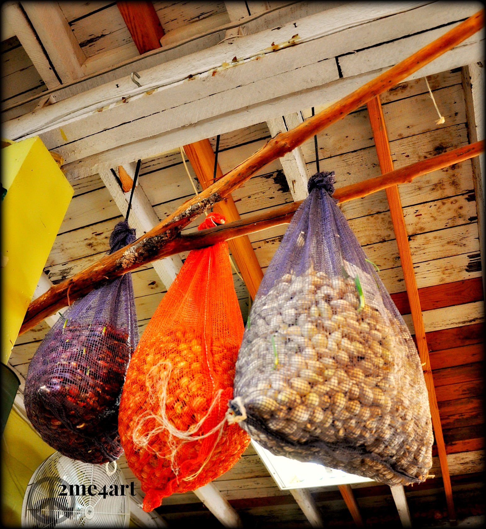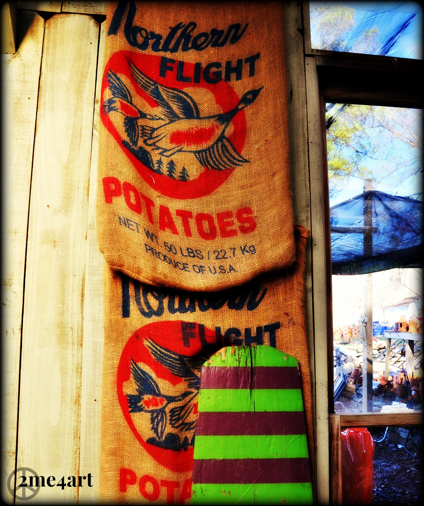 The couple who owns Myers Garden shop were so very friendly. I was given a bit of history here. The gentleman started working in this business when he was six years oldAnother view of the net bags filled with bulbs, just waiting for springThe owner saw an older woman throwing this away. She said that her son made it when he was five years old, he is now in his 50’s. These cotton balls are still white?! She must have great storage. Alabama made from a bagI love the old potato bags with the modern looking striped board. Myers Plants & Pottery